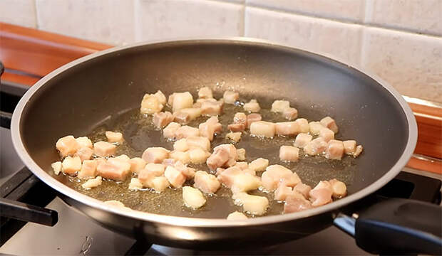 3. Пока картофель запекается, подготовьте мясную начинку. Свиная грудинка нарежьте маленькими кубиками или полосками. Разогрейте сковороду с небольшим количеством растительного масла и обжарьте грудинку до золотистой корочки, чтобы жир немного вытопился, а мясо стало ароматным и хрустящим снаружи.