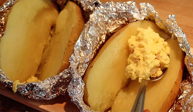 6. Когда картофель полностью запечется, выньте его из духовки, аккуратно разверните фольгу и остудите пару минут, чтобы можно было безопасно работать с руками. Разрежьте каждую картофелину пополам вдоль, не вынимая мякоть, чтобы образовалась небольшая «лодочка». Ложкой аккуратно наполните каждую половинку приготовленной мясной и сливочной смесью.