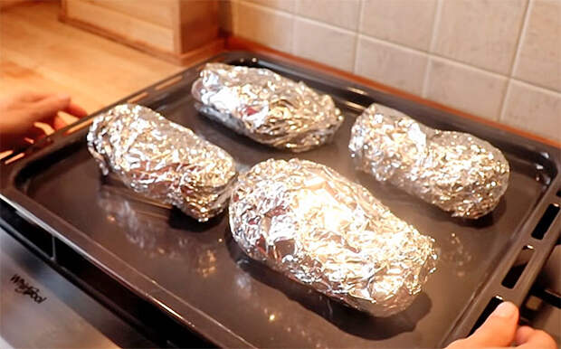 2. Заверните каждую картофелину в фольгу, плотно закрыв концы, чтобы она пропеклась равномерно и осталась сочной. Поставьте картошку в разогретую духовку и запекайте примерно 40–60 минут, в зависимости от размера. Проверить готовность можно ножом — он должен легко входить в картофель. За несколько минут до готовности аккуратно разверните верх фольги, чтобы верх слегка подсох и образовалась золотистая корочка.