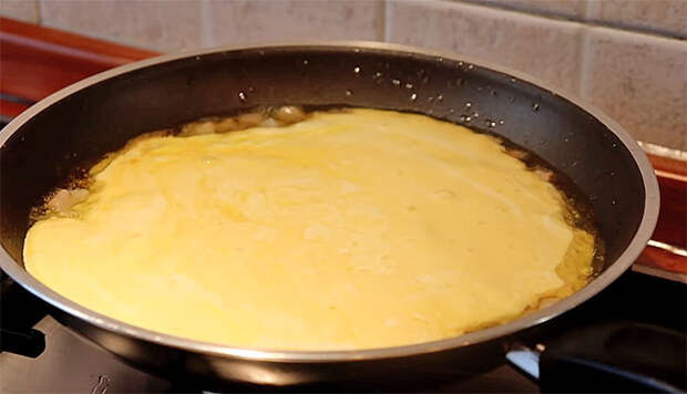 5. Вылейте яично-сливочную смесь на сковороду с обжаренной грудинкой и готовьте на среднем огне 3–4 минуты, постоянно помешивая, чтобы масса слегка загустела, но не превратилась в омлет.