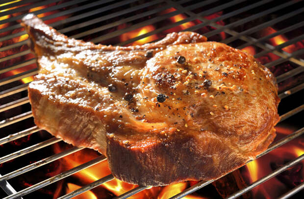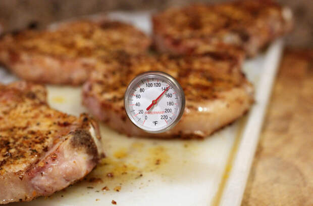 Оптимальная температура готовности свинины — около 65 °C, снимайте с гриля при 60 °C. После приготовления дайте отбивным «отдохнуть» 5 минут под фольгой — сок распределится равномерно, а середина пропечется.