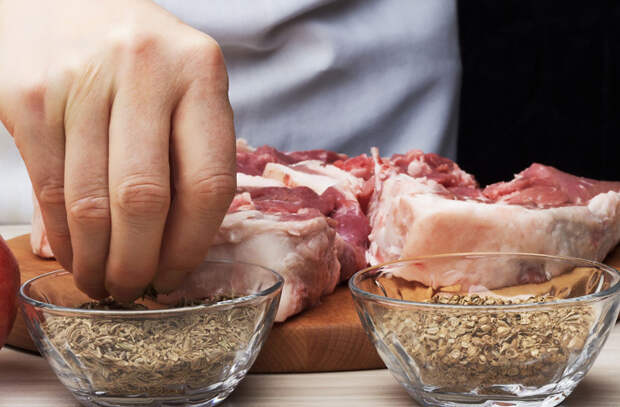 Через два часа мясо станет мягким и упругим. По желанию добавьте веточки зелени или специи — они усилят аромат. После засаливания промойте мясо, чтобы убрать лишнюю соль.Сухие специи и подготовка гриля