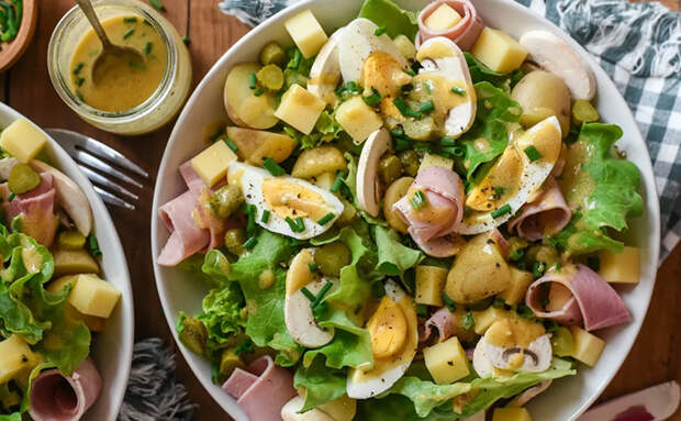 Французская кухня считается изысканной, но здесь есть и простые, не лишенные изящества блюда. Одно из таких — классика парижских бистро, салат Паризьен. Он относится к разряду salade complete, то есть получается сытным и питаельным. Ветчина, молодой картофель, нежный сыр и яйца: салат можно смело подавать вместо полноценного обеда.