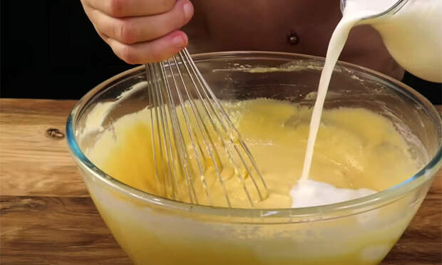 Подготовьте продукты: достаньте их из холодильника, чтобы они стали комнатной температуры. Масло растопите до состояния густой сметаны. В миске взбейте яйца с сахаром, солью и ванилином венчиком до однородности. Влейте масло или маргарин, снова перемешайте. Всыпьте просеянную муку, тщательно размешайте, чтобы не было комочков.