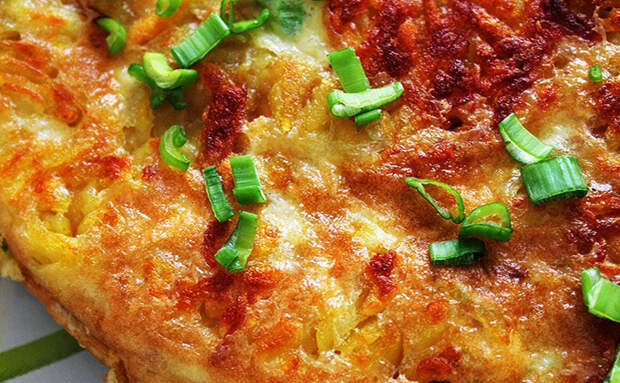 Введите яйца, добавьте соль, перец и немного куркумы, перемешайте так, чтобы смесь стала однородной и впитала крахмал. Картофель пустит немного сока, и масса станет более пластичной. Разогрейте глубокую скородку диаметром около 26 см, слегка смажьте маслом и убедитесь, что разогрев умеренный, но не высокий, чтобы нижний слой картофеля не схватился.