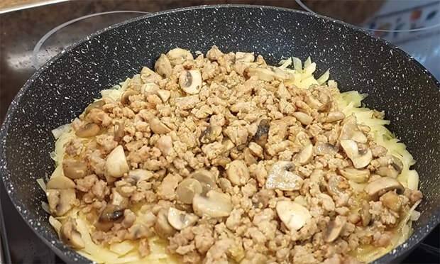 Сковородку верните на огонь, добавьте масло и выложите фарш. Жарьте до полной выпарки жидкости и легкого подрумянивания, перемешивая. Когда фарш стал рассыпчатым, соедините его с грибами и оставьте начинку остывать несколько минут. Если хотите, вмешайте столовую ложку томатной пасты и дополнительные специи. Вернитесь к картофелю. Откиньте его на сито или отожмите руками, затем перелейте воду со дна, чтобы собрать крахмал, и переложите картофель в большую миску.