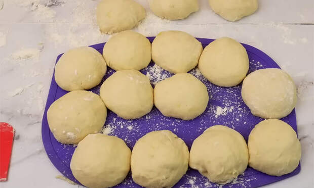 Обомните поднявшееся тесто и разделите его на 18 равных частей (примерно по 60 г), скатав каждую в аккуратный шарик-колобок.