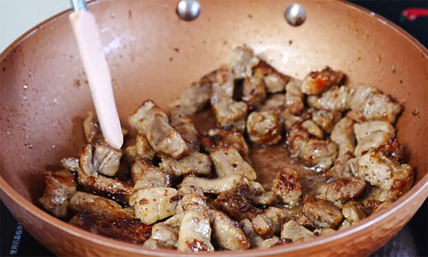 Обжаренное до красивого цвета мясо переложите в отдельную посуду, а баклажаны отряхните от выделившейся жидкости и отправьте в ту же сковороду, где жарилась свинина, добавив при необходимости немного масла.