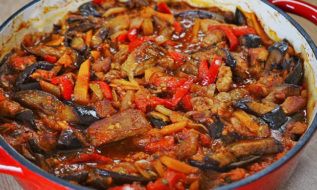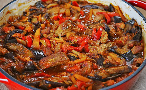 Соедините в одной посуде (можно использовать казан или форму для запекания) обжаренное мясо, баклажаны и подготовленный овощной соус, аккуратно перемешивая массу, которая должна быть густой, а не жидкой. Накройте емкость крышкой и отправьте в разогретую до 200 ∘ C духовку примерно на 30 минут, чтобы продукты пропитались ароматами друг друга. Если духовки нет, блюдо можно тушить на плите на огне ниже среднего под крышкой в течение того же времени.