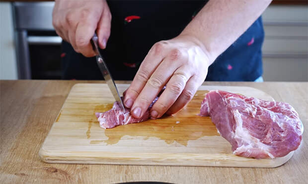 Нарежьте баклажаны крупными брусочками, переложите их в глубокую емкость, посыпьте солью и тщательно перемешайте, чтобы соль распределилась по каждому кусочку, затем отставьте их в сторону, чтобы ушла лишняя горечь и влага. В это время нарежьте свинину такими же по размеру кусочками, как и баклажаны, чтобы блюдо смотрелось гармонично, и отправьте мясо на разогретую сковороду для обжаривания до румяной корочки. Пока мясо жарится, нарежьте репчатый лук четверть-кольцами толщиной около полусантиметра, а морковь нарежьте наискосок пластинами.