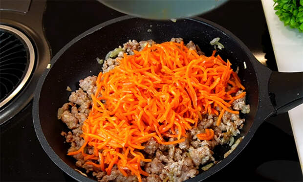 Нарежьте луковицу мелко и обжарьте на небольшом количестве растительного масла до золотистого цвета, затем добавьте фарш и перемешайте, чтобы он прожаривался равномерно. Приправьте смесь солью, черным перцем и кориандром, доведите фарш до готовности и вмешайте сметану, добиваясь более сочной структуры начинки, после чего снимите сковороду с огня.