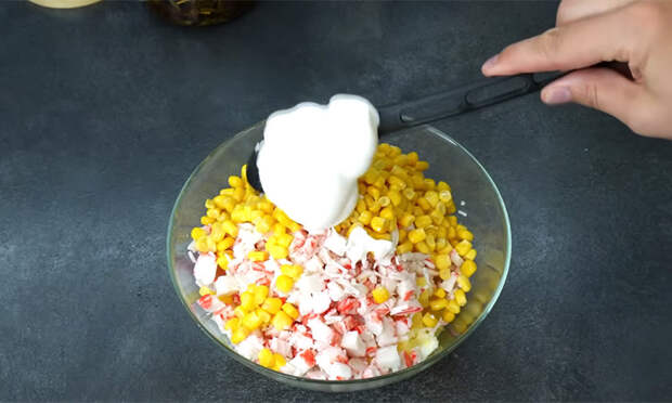 Добавьте кубики ананаса, дав им немного обсохнуть, чтобы сок не разжижал заправку, затем введите выбранный ингредиент: для более сытного и сливочного вкуса нарежьте твердый сыр, для легкого и свежего варианта используйте огурец. Всыпьте кукурузу, пропустите чеснок через пресс, если готовите версию с сыром, и соедините с майонезом, перемешивая так, чтобы ингредиенты распределились равномерно и структура салата осталась объемной.