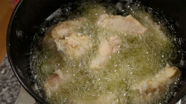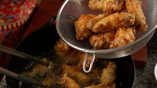 4. Жарка. Разогрейте сковороду с антипригарным покрытием или вок. Налейте масло так, чтобы оно покрыло дно толщиной около 1 см. Когда масло станет горячим, выкладывайте крылышки небольшими порциями, чтобы они жарились равномерно и масло не охлаждалось. Обжаривайте примерно 8–10 минут, переворачивая каждые 2–3 минуты до золотистой корочки.