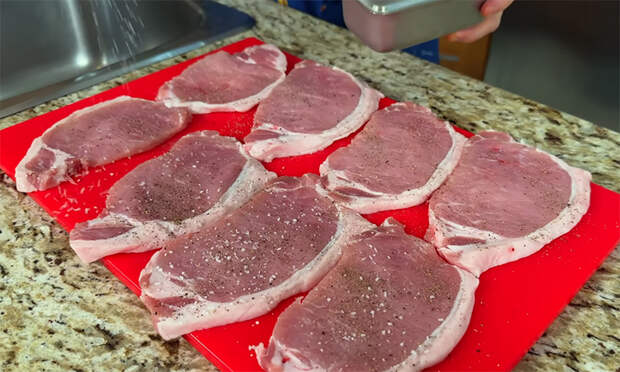 Свинину заранее достаньте из холодильника, нарежьте поперек волокон ломтиками толщиной около половины сантиметра и слегка отбейте, не превращая в тонкие отбивные. Посолите и поперчите мясо с обеих сторон и оставьте прогреваться и мариноваться. Лук нарежьте полукольцами, грибы тонкими ломтиками, картофель нарежьте на мандолине или острым ножом одинаковыми пластинами и сразу отправьте в воду, чтобы он не темнел.
