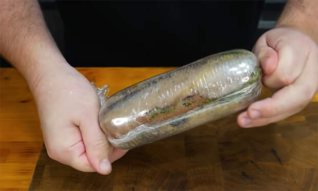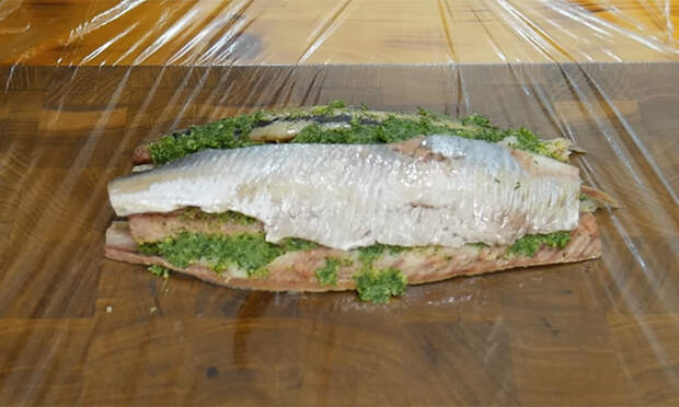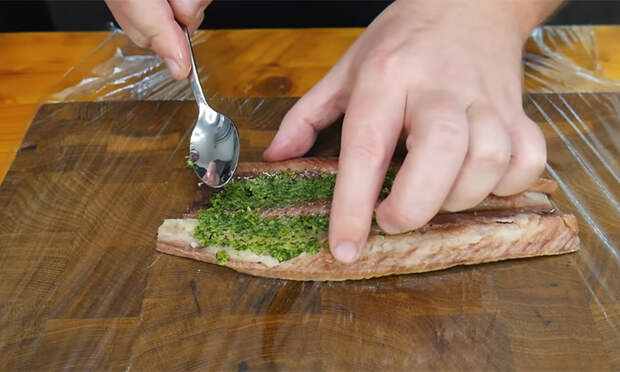 Распределите тонкий слой ароматной смеси по поверхности рыбы, не делая его слишком толстым, чтобы структура оставалась плотной. Уложите следующий слой филе, затем снова нанесите смесь, закрывая ее оставшимися кусками. Когда слои будут собраны, начните туго скручивать рыбу в рулет, плотно подтягивая пленку, чтобы исключить пустоты и добиться цилиндрической формы. Подожмите концы, завернув их под рулет, и обмотайте его дополнительным слоем пленки, чтобы структура не ослабла.