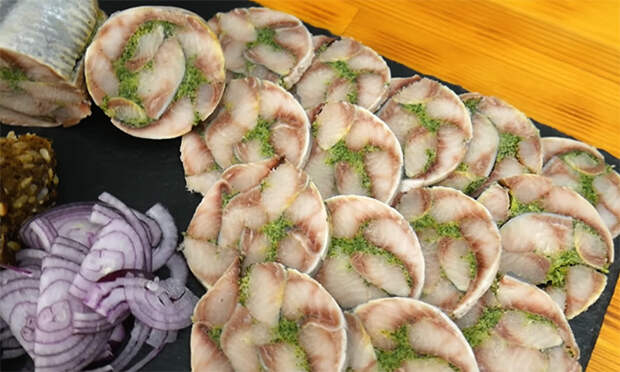 Готовое атлантическое сало удобно нарезать и подавать с черным хлебом и свежим луком, они подчеркнут его выразительный вкус.