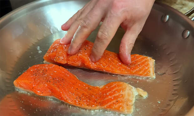 Нагрейте сковороду до средней температуры, добавьте масло и уложите рыбу кожей вниз, слегка прижимая, чтобы добиться равномерного контакта и будущей хрустящей корочки. Ориентируйтесь на подъем светлой полосы по бокам, чтобы понимать степень прожарки. После переворота уменьшите нагрев и доведите рыбу до готовности, ориентируясь на внутреннюю температуру 63°, затем снимите со сковороды и накройте, чтобы она дошла и не остыла.