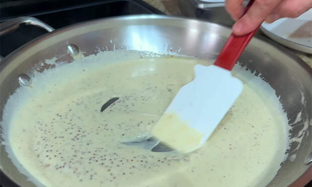 Уменьшите нагрев и введите сливки, посолите и поперчите по вкусу, дайте соусу загустеть в течение нескольких минут, поддерживая слабый огонь. Когда он станет плотнее, процедите, верните в чистую емкость и вмешайте дижонскую горчицу. Выложите рыбу на тарелку кожецей кверху, полейте теплым соусом.