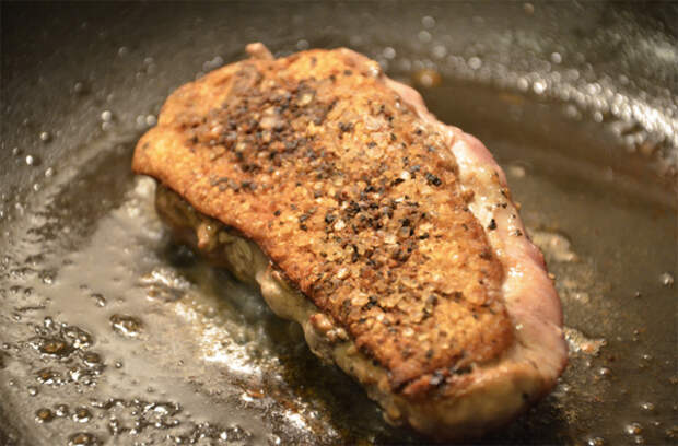 Под кожей утки прячется слой жира. Чтобы получить золотистую, хрустящую корочку, грудки выкладывают на холодную сковороду кожей вниз и выставляют небольшой огонь. Жир будет постепенно вытапливаться, и грудка покроется хрустящей румяной корочкой.