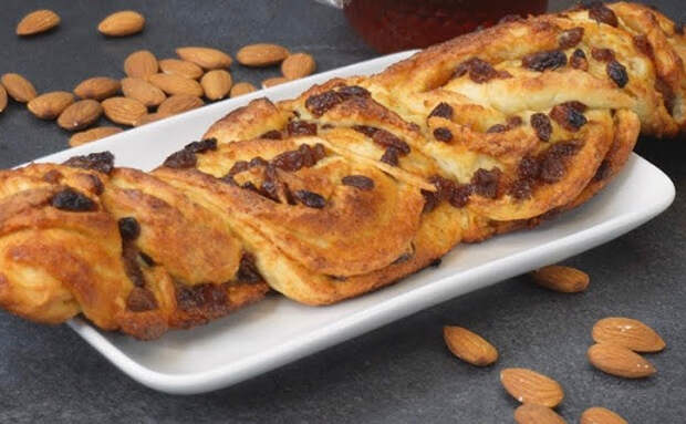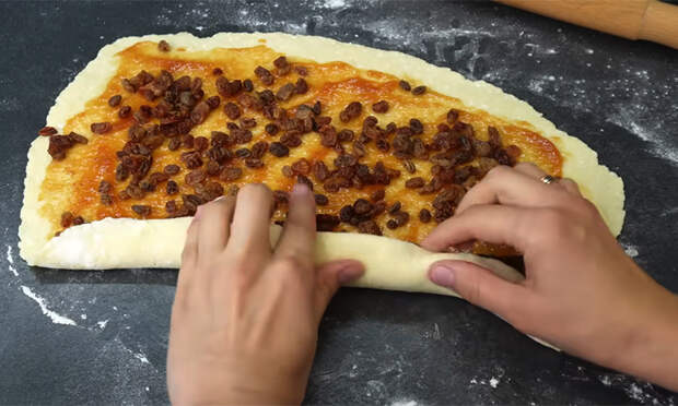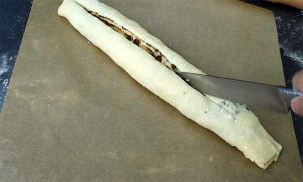 Подпылите стол, раскатайте тесто в пласт толщиной около трех миллиметров. Смажьте поверхность повидлом, распределите изюм и разровняйте начинку тонким слоем. Сверните рулет, закрепите шов, переложите на лист бумаги для выпечки и разрежьте вдоль на две части, не доходя до конца.