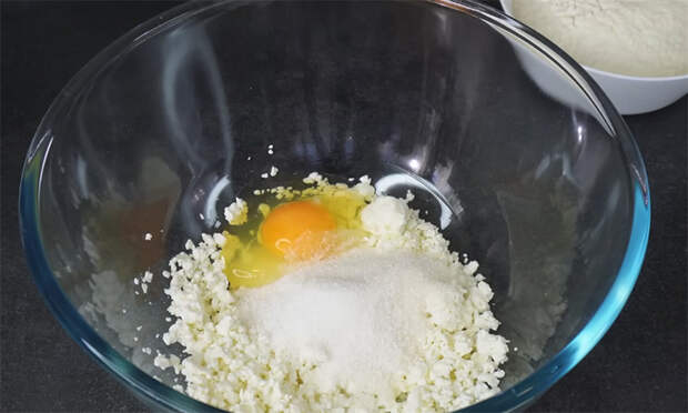 Соедините творог, сахар, ванильный сахар, яйцо и соль, разомните вилкой до однородности.