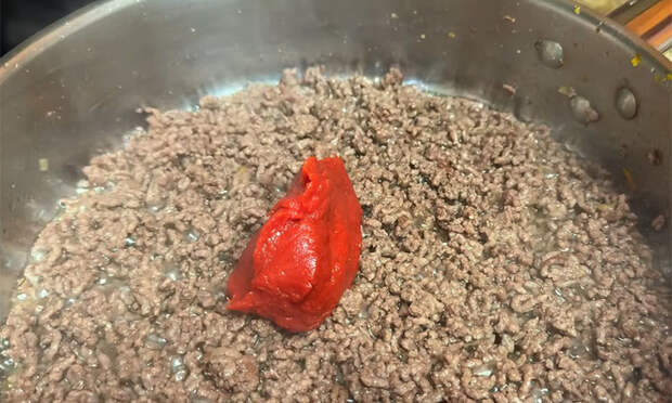 Добавьте томатную пасту, лавровый лист и копченую парику, прогрейте все вместе еще минуту. Всыпьте столовую ложку муки для густоты соуса, перемешайте и влейте стакан кипятка.