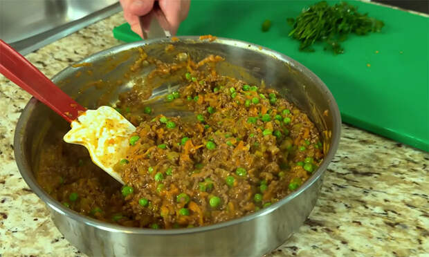 Добавьте зеленый горошек, протушите мясную основу под крышкой около 5 минут и в конце посыпьте свежей зеленью.