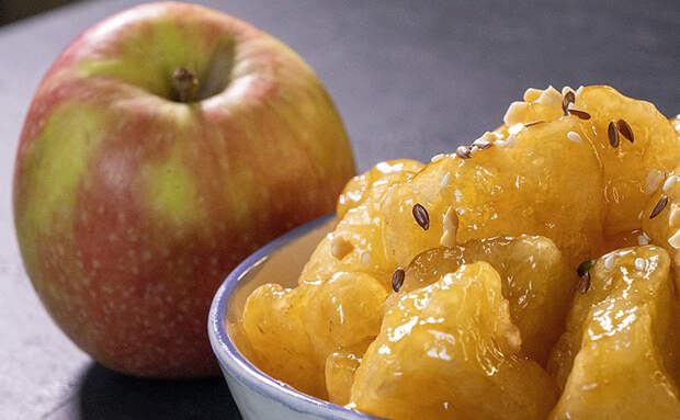 Стоит один раз приготовить эти яблоки, чтобы понять, насколько изысканным может быть самый простой продукт. После двойной обжарки они становятся мягкими, как суфле, но покрываются тонкой карамельной корочкой, которая приятно хрустит. Кунжут и орехи добавляют свой уровень аромата, а кисло-сладкий сироп подчеркивает вкус фруктов.