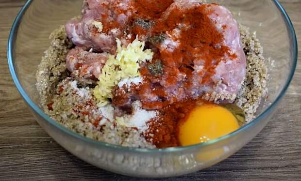 2. В остывшую (тёплую, но не горячую) гречневую массу добавьте: 150 г фарша, 1 яйцо, 2 ст. л. муки, паприку, соль и перец. Тщательно перемешайте массу руками или ложкой до полной однородности. По консистенции она должна быть плотной, лепкой, легко формируемой.
