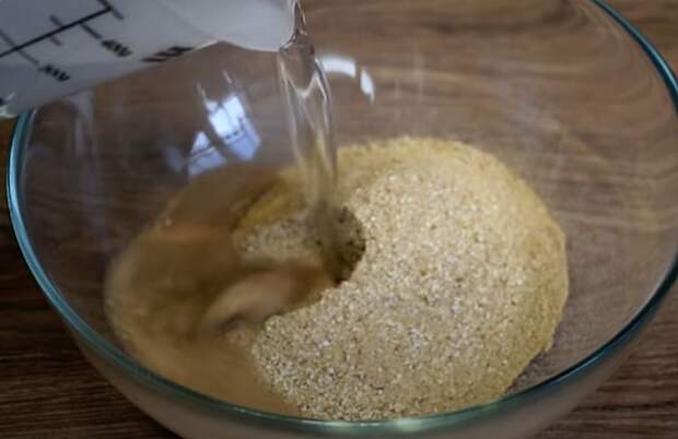 1. Измельчите 200 г гречневой крупы в блендере или кофемолке до состояния мелкой крошки (как грубая мука или манка). Переложите перемолотую гречку в глубокую миску. Залейте её 500 мл кипятка, хорошо перемешайте и накройте крышкой или тарелкой. Дайте настояться 5–7 минут — гречка набухнет и впитает воду, превратившись в вязкую кашу.