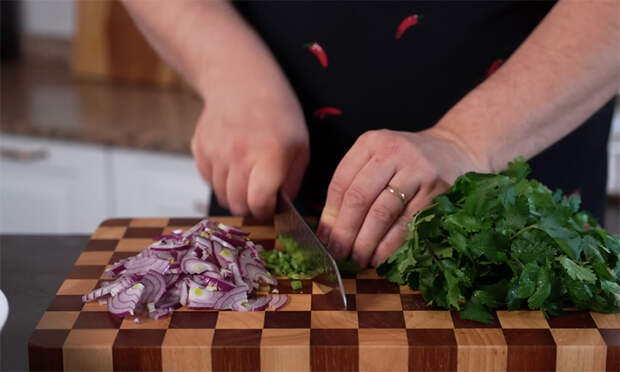 Возьмите белую и красную фасоль, слейте лишнюю жидкость и переложите бобовые в глубокую миску. Красный лук нарежьте четвертькольцами, стараясь делать ломтики тонкими для лучшей пропитки маринадом. Мелко нарубите большой объем свежей зелени — кинзу, петрушку, укроп и сельдерей, так как именно зелень задает основной вкус салата.
