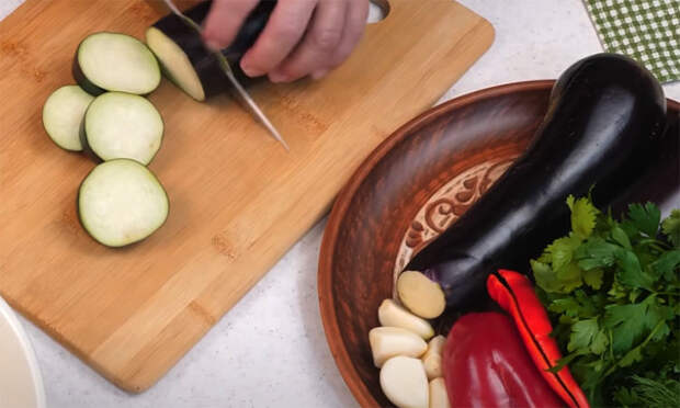 1. Тщательно вымойте баклажаны и обсушите. Нарежьте кружочками толщиной около 1,5 см. Солить и вымачивать в соленой воде не нужно — современные сорта не горчат.