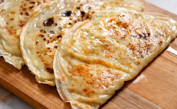Эти лепешки отличаются от привычных: здесь не нужно возиться с раскаткой теста, оно готовится жидким и сразу заливается в сковороду. Начинка из творога, сыра и зелени в сочетании со сливочным маслом получается нежной и насыщенной по вкусу, а подрумяненные лепешки напоминают тонкий домашний лаваш, который отлично в качестве перекуса, или замены магазинного хлеба.