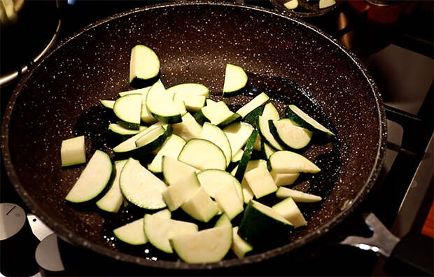 2. Вымойте кабачки и нарежьте кружочками толщиной около 5 мм. Кожицу можно не счищать, если она тонкая. В сковороде разогрейте немного растительного масла. Обжаривайте кабачки на среднем огне в течение 8–10 минут, периодически помешивая. Они должны стать мягкими, но не рассыпаться. В конце слегка посолите и поперчите.