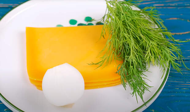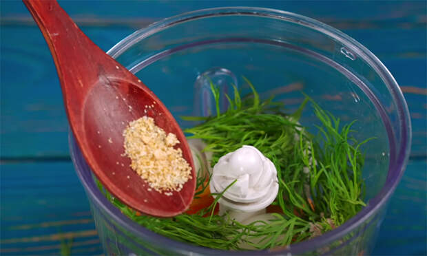 2. К сыру в блендер добавить мелко нарезанный лук и укроп. Затем посолить, поперчить и добавить сушеный чеснок и выбранные специи. При желании можно добавить щепотку пряностей, чтобы подчеркнуть вкус сыра.