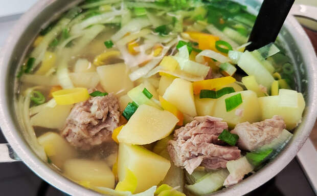 Вскипятите воду в кастрюле объёмом 3 литра. Тем временем очистите картофель, тщательно промойте и нарежьте его крупными кубиками. Чем крахмалистее сорт, тем гуще получится суп — картофель слегка разварится и сделает бульон насыщенным. Когда вода закипит, положите нарезанный картофель. Варите его около 15 минут. В это время подготовьте заправку: очистите и нарежьте кубиками лук и морковь.