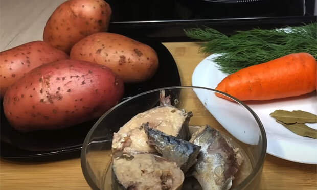Наваристую уху приготовить можно и из доступной рыбной консервы — в нашем варианте это скумбрия в масле, но подойдет и почти любая другая. Такая база делает бульон плотным, маслянистым, с выраженным вкусом. Основу дополняет картофель крупной нарезки и зажарка из моркови и лука, суп варится почти сам по себе, достаточно просто сложить все ингредиенты в кастрюлю.