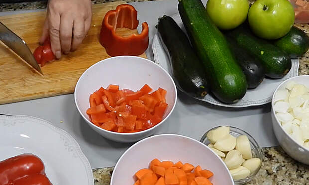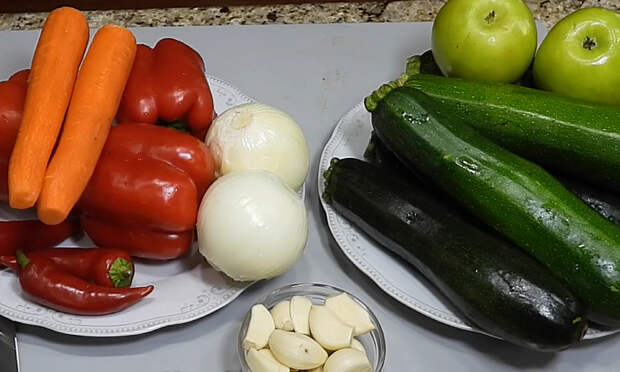1. Кабачки промыть, при необходимости очистить от кожицы, нарезать кубиками 2–3 см. Лук очистить и нарезать мелкими кубиками или полукольцами. Морковь очистить, натереть на крупной терке или нарезать соломкой. Болгарский перец очистить от семян и перегородок, нарезать кубиками. Яблоки очистить от сердцевины и нарезать кубиками. Острый перец очистить от семян (если хотите менее острое блюдо, оставьте меньше семян) и мелко нарезать. Чеснок очистить и измельчить ножом или пропустить через пресс.