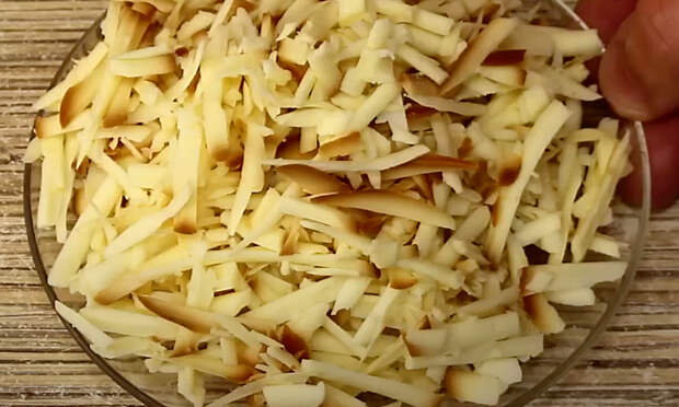 4. Яйца сварить вкрутую (примерно 10 минут после закипания воды), остудить в холодной воде, очистить и натереть на крупной терке. Добавление яиц делает салат более сытным и питательным.