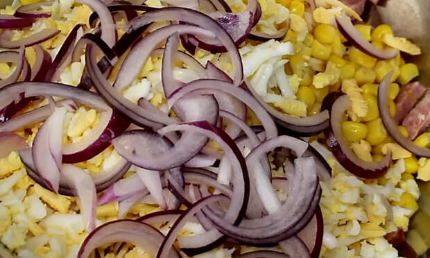 3. Лук очистить и нарезать тонкими полукольцами. Чтобы лук был мягче и не давал резкого вкуса, можно предварительно обдать его кипятком или замариновать на 5–10 минут в небольшой миске с солью и уксусом.