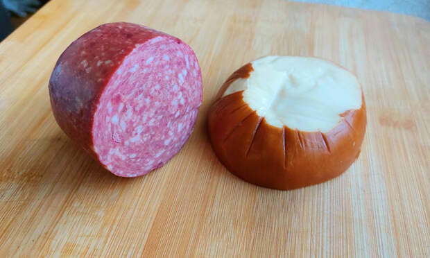 1. Колбасу нарезать тонкими брусочками или кубиками примерно одинакового размера.