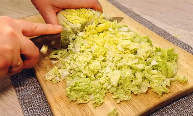 Нарежьте пекинскую капусту тонкими полосками, промойте и дайте воде стечь. Мелко нарежьте зеленый лук. Подготовьте сосиски, сделайте на каждой несколько продольных надрезов, чтобы они быстрее и равномернее прожарились и не потеряли форму. Разбейте яйца в миску, добавьте соль, перец и сухой чеснок, взбейте венчиком или вилкой до однородного состояния, затем добавьте капусту и зеленый лук, перемешайте до равномерного распределения.