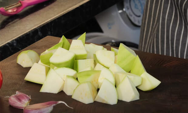 Очистите кабачок, нарежьте его крупными кусками и обсушите. Помидоры обдайте кипятком или обожгите горелкой, снимите кожицу и нарежьте крупными дольками. Сельдерей нарежьте мелким кубиком, чеснок измельчите. На сковороде растопите сливочное масло, выложите кабачки и обжарьте их 3–4 минуты до лёгкого золотистого оттенка.