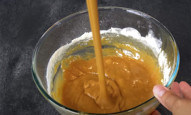 В кастрюле соедините мёд, сахар и сливочное масло, растопите на небольшом огне до однородности. Сметану смешайте с содой, дайте постоять, затем добавьте к медовой смеси вместе с щепоткой соли, перемешайте до пены и проварите пару минут до карамельного оттенка. Остудите, затем вмешайте яйцо и муку.