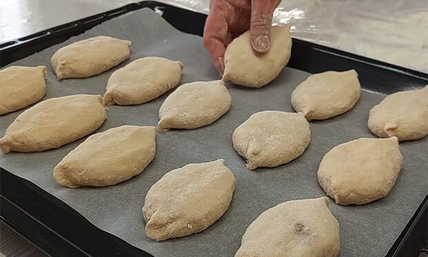 Посыпьте стол мукой, достаньте тесто и разделите его пополам. Каждую часть раскатайте и нарежьте на небольшие лепешки. На середину каждой выложите начинку, защипните края. Переложите пирожки на противень с пергаментом, смазав поверхность взбитым яйцом. Выпекайте 15–20 минут до румяности. Когда пирожки слегка остынут, можно подавать их с молоком или чаем. Они мягкие, ароматные и долго не черствеют, оставаясь вкусными даже на следующий день.