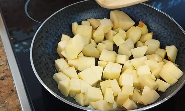 Для начинки очистите яблоки, нарежьте средним кубиком и сразу выложите на разогретую сковороду с растопленным сливочным маслом. Обжаривайте на среднем огне, время от времени перемешивая. Когда начнут румяниться, добавьте немного лимонной кислоты, сахар и корицу. Растворите крахмал в холодной воде и влейте к яблокам, быстро перемешайте, снимите с огня.