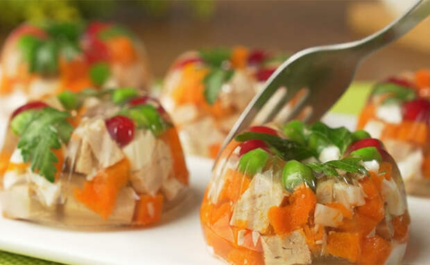 Затем аккуратно отделите края заливного пальцем или тонким ножом, выньте заливное из формы и переложите на блюдо. Украсьте листиками салата или ягодами, создавая аккуратный общий вид, и распределите мини-заливное так, чтобы каждый элемент смотрелся аккуратно.