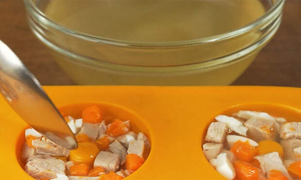 В каждую формочку выложите по одному кружку яйца желтком вниз, слегка прижмите, чтобы он лег ровно. Добавьте поверх яйца мясо, распределив его столько, сколько хотите, чтобы сохранить гармоничную толщину слоев. Влейте бульон в формочки, проследите, чтобы он заполнил пространство равномерно, и при необходимости долейте.