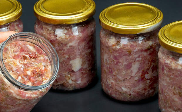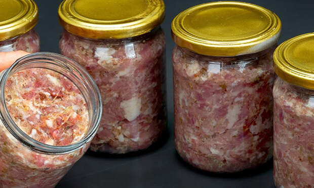 Тщательно перемешайте массу до однородности. Подготовьте полулитровые стеклянные банки. Заполните их фаршем плотно, но не доверху — оставьте около 2 см до края. Закройте крышками. Банки поставьте в кастрюлю, дно застелите полотенцем. Залейте холодной водой до уровня плечиков банок. Добавьте ложку уксуса. Доведите до кипения и стерилизуйте под крышкой 90 минут на слабом огне.