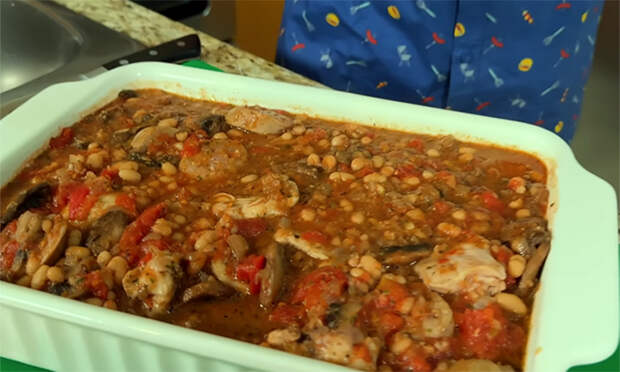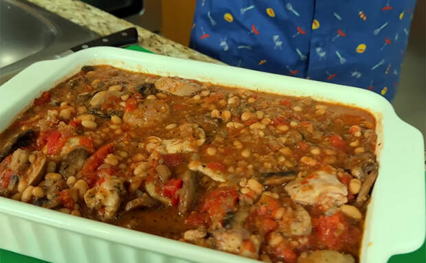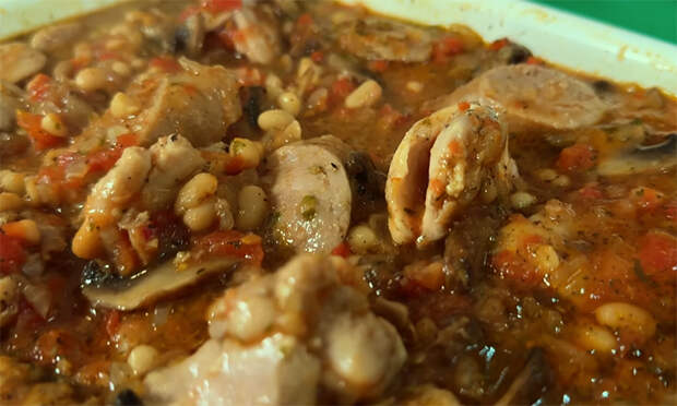 Часть зелени оставьте для подачи, остальное вмешайте в томатно-фасолевый соус в конце тушения, чтобы она дала свежий аромат и аккуратную зелень в общей массе. Соедините все компоненты. Возьмите жаропрочную форму объемом около 3 л. На дно переложите курицу с купатами, грибами и луком вместе со всем соком из сковороды и распределите ровным слоем. Сверху влейте горячий томатно-фасолевый соус с чесноком и зеленью, аккуратно разровняйте. Можно слегка перемешать верхний слой, чтобы соус частично ушел между кусками мяса, но оставьте видимые фрагменты фасоли и томатов.